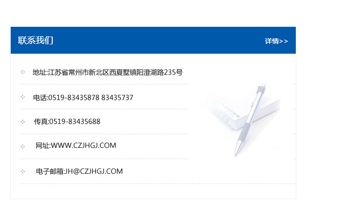 地址:常州市新北區友邦商務大廈1幢16、17層  電話:0519-85101652  傳真:0519-85112595  郵編:213022  網址:www_cz-jiayue_cn.ahkl168.com  郵箱:xiajifengaa@163.com